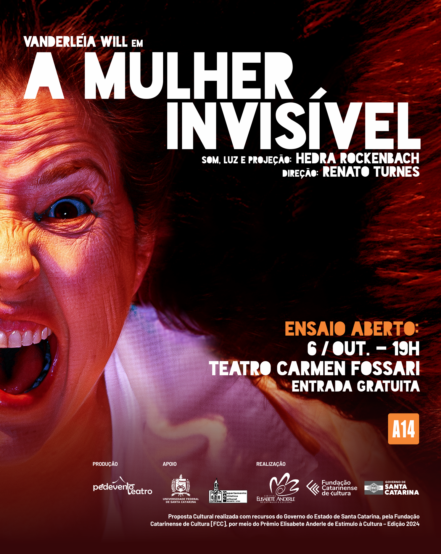 O Departamento Artístico Cultural (DAC) da Secretaria de Cultura, Arte e Esporte da UFSC (SeCArtE) apresenta a pré-estreia/ensaio aberto do espetáculo A Mulher Invisível, montagem inédita da Cia Pé de Vento Teatro, dirigida por Renato Turnes e protagonizada pela atriz Vanderléia Will. A apresentação acontece no dia 6 de outubro de 2025 (segunda-feira), às 19h, no Teatro Carmen Fossari, com entrada gratuita e classificação indicativa de 14 anos. O espetáculo aborda a invisibilidade e o envelhecimento feminino, trazendo à cena uma reflexão sobre o etarismo, a violência cotidiana e o direito à existência plena da mulher em todas as fases da vida.
