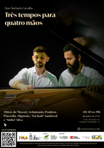 O Departamento Artístico Cultural (DAC) da Secretaria de Cultura, Arte e Esporte da UFSC (SeCArtE) apresenta na Igrejinha da UFSC, no dia 8 de outubro de 2025 (quarta-feira), às 19h, o recital didático do projeto “Três tempos para quatro mãos”, com o Duo Machado-Carvalho.