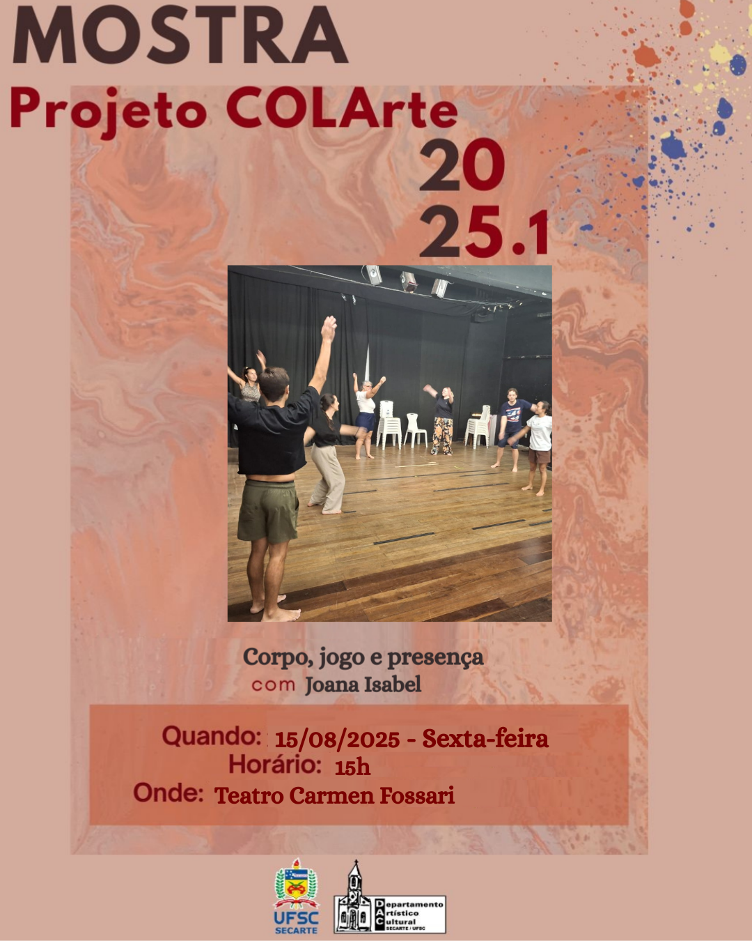 O Projeto COLArte, do Departamento Artístico Cultural (DAC) da UFSC, convida a comunidade universitária e o público em geral para participar da Mostra do Projeto COLArte, que será realizada no dia 15 de agosto de 2025 (sexta-feira), das 15h às 17h, no Teatro Carmen Fossari – DAC.